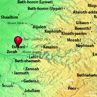 Atlas ![]() Zorah and surrounding area Maps Created using Biblemapper 3.0 Additional data from OpenBible.info You are free to use up to 50 Biblos coprighted maps (small or large) for your website or presentation. Please credit Biblos.com. Occurrences Joshua 15:33 In the lowland, Eshtaol, Zorah, Ashnah,Joshua 19:41 The border of their inheritance was Zorah, Eshtaol, Irshemesh, Judges 13:2 There was a certain man of Zorah, of the family of the Danites, whose name was Manoah; and his wife was barren, and didn't bear. Judges 13:25 The Spirit of Yahweh began to move him in Mahaneh Dan, between Zorah and Eshtaol. Judges 16:31 Then his brothers and all the house of his father came down, and took him, and brought him up, and buried him between Zorah and Eshtaol in the burial site of Manoah his father. He judged Israel twenty years. Judges 18:2 The children of Dan sent of their family five men from their whole number, men of valor, from Zorah, and from Eshtaol, to spy out the land, and to search it; and they said to them, "Go, explore the land!" They came to the hill country of Ephraim, to the house of Micah, and lodged there. Judges 18:8 They came to their brothers to Zorah and Eshtaol: and their brothers said to them, "What do you say?" Judges 18:11 There set forth from there of the family of the Danites, out of Zorah and out of Eshtaol, six hundred men girt with weapons of war. 2 Chronicles 11:10 and Zorah, and Aijalon, and Hebron, which are in Judah and in Benjamin, fortified cities. Nehemiah 11:29 and in En Rimmon, and in Zorah, and in Jarmuth, Encyclopedia ZORAHzo'-ra (tsor`ah; Saraa): A city on the border of Dan, between Eshtaol and Ir-shemesh (Joshua 19:41); the birthplace of Samson (Judges 13:2, 25); near here too he was buried (Judges 16:31); from here some Danites went to spy out the land (Judges 18:2, 11). In Joshua 15:33 it is, with Eshtaol, allotted to Judah, and after the captivity it was reinhabited by the "children of Judah" (Nehemiah 11:29, the King James Version "Zareah"). It was one of the cities fortified by Rehoboam (2 Chronicles 11:10). It is probable that it is mentioned under the name Tsarkha along with Aialuna (Aijalon; 2 Chronicles 11:10) in the Tell el-Amarna Letters(No. 265, Petrie) as attacked by the Khabiri. ZORAH, or Zore'ah and Za'reah, now called Surah, 13 ms. w. of Jerusalem. It is a village on the top of a hill, 1170 ft. above the Mediterranean, overlooking the valley of Sorek. Josh. 19; 41, Judg. 13:2, 25, 16:31, 18:2, etc. Strong's Hebrew H6881: Tsoraha city exchanged by Judah and Dan |