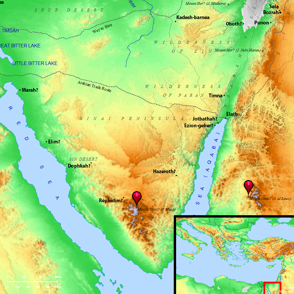Jebel Musa has two main tops, that to the Southeast being crowned by a chapel. The other, divided by gorges into three precipitous crags, has the Convent to its North, and is called Ras-es-Cafcafeh, or "the willow top." North of the Convent is the lower top of Jebel edition Deir ("mountain of the monastery"). These heights were accurately determined by Royal Engineer surveyors in 1868 (Sir C. Wilson, Ordnance Survey of Sinai); and, though it is impossible to say which of the peaks Moses ascended, yet they are all much higher than any mountains in the Sinaitic desert, or in Midian. The highest tops in the Tih desert to the North are not much over 4,000 ft. Those in Midian, East of Elath, rise only to 4,200 ft. Even Jebel Serbal, 20 miles West of Sinai-a ridge with many crags, running 3 miles in length-is at its highest only 6,730 ft. above the sea. Horeb is not recorded to have been visited by any of the Hebrews after Moses, except by Elijah (1 Kings 19:8) in a time of storm. In favor of the traditional site it may also be observed that clouds suddenly formed, or lasting for days (Exodus 24:15 f), are apt to cap very lofty mountains. The Hebrews reached Sinai about the end of May (Exodus 19:1) and, on the 3rd day, "there were thunders and lightnings, and a thick cloud upon the mount" (Exodus 19:16). Such storms occur as a rule in the Sinaitic desert only in December and January, but thunderstorms are not unknown in Palestine even in May.