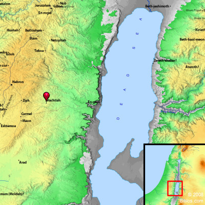 Atlas ![]() Hachilah and surrounding region Maps Created using Biblemapper 3.0 Additional data from OpenBible.info You are free to use up to 50 Biblos coprighted maps (small or large) for your website or presentation. Please credit Biblos.com. Occurrences 1 Samuel 23:19 Then the Ziphites came up to Saul to Gibeah, saying, "Doesn't David hide himself with us in the strongholds in the wood, in the hill of Hachilah, which is on the south of the desert?1 Samuel 26:1 The Ziphites came to Saul to Gibeah, saying, "Doesn't David hide himself in the hill of Hachilah, which is before the desert?" 1 Samuel 26:3 Saul encamped in the hill of Hachilah, which is before the desert, by the way. But David stayed in the wilderness, and he saw that Saul came after him into the wilderness. Encyclopedia HACHILAH, HILL OFha-ki'-la, hak'-i-la, (chakhilah): A hill in the wilderness of Judah, associated with the wanderings of David. It is stated (1 Samuel 23:19) to be "on the South of the desert" (or Jeshimon), and (1 Samuel 26:1) to be "before (on the front (i.e. edge) of) the desert." It was near Ziph and Maon. The only plausible hypothesis is that it is represented by the ridge Dhahret el-Kolah in the wilderness of Ziph, toward the desert of En-gedi (PEF, III, 313, Sh XXI). Strong's Hebrew H2444: Chakilah"dark," a hill in S. Judah |